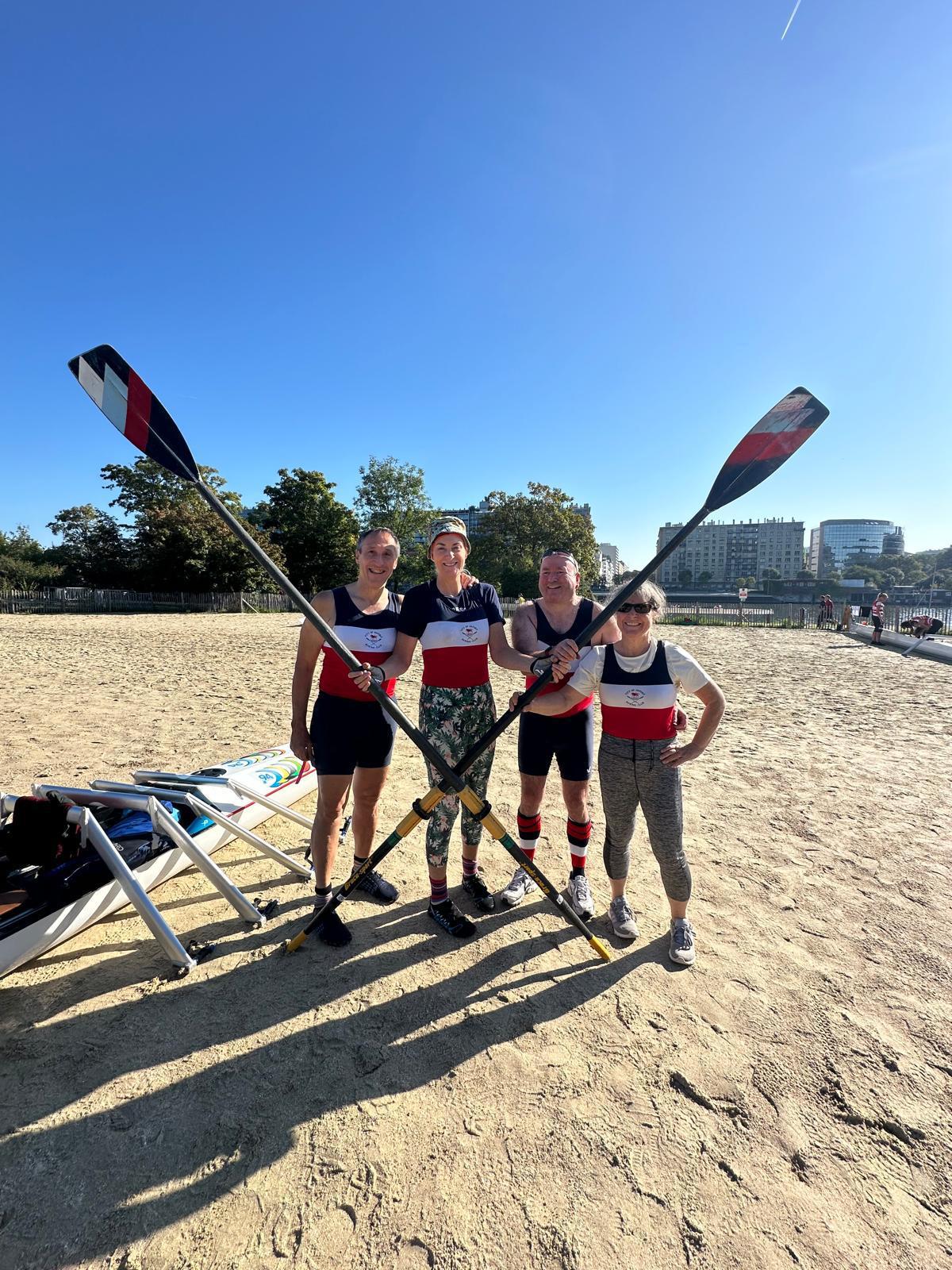 A small, mixed group of committed, mature rowers, who enjoy the challenge of mastering the finer art of sculling. We train together regularly with a qualified coach – 4 outings a week during summer months and weights and ergs in the winter when the river is flooded. We also plan to take part in iconic, endurance races (Monster the Loch, Vogalonga, La Traversée de Paris, Ocean to City in Cork, Ireland). We also enjoy organising squad, social events to maintain the team energy.